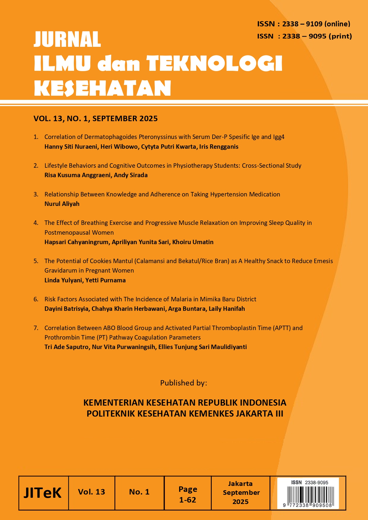 Jurnal Ilmu dan Teknologi Kesehatan, well known as JITek, p-ISSN : 2338-9095 (Print), e-ISSN : 2338-9109 (Online), registered in the CrossRef system with Digital Object Identifier (DOI) prefix 10.32668, indexed by Directory of Open Access Journals (DOAJ)Google scholar and Google Scholar Metric, is an open access, peer-reviewed journal published twice a year, on March and September, by Poltekkes Kemenkes Jakarta III. JITek presenting timely research on all aspects of vocational health that has not been published by other media. A broad outline of the journal's scope includes physiotherapy, nursing, midwifery, medical laboratory, environmental health, and nutrition. The journal keeps the readers: health care and public health professional, health services researchers, lecturers, teachers, students, social scientists, policymakers up-to-date on current vocational issues related to vocational health.